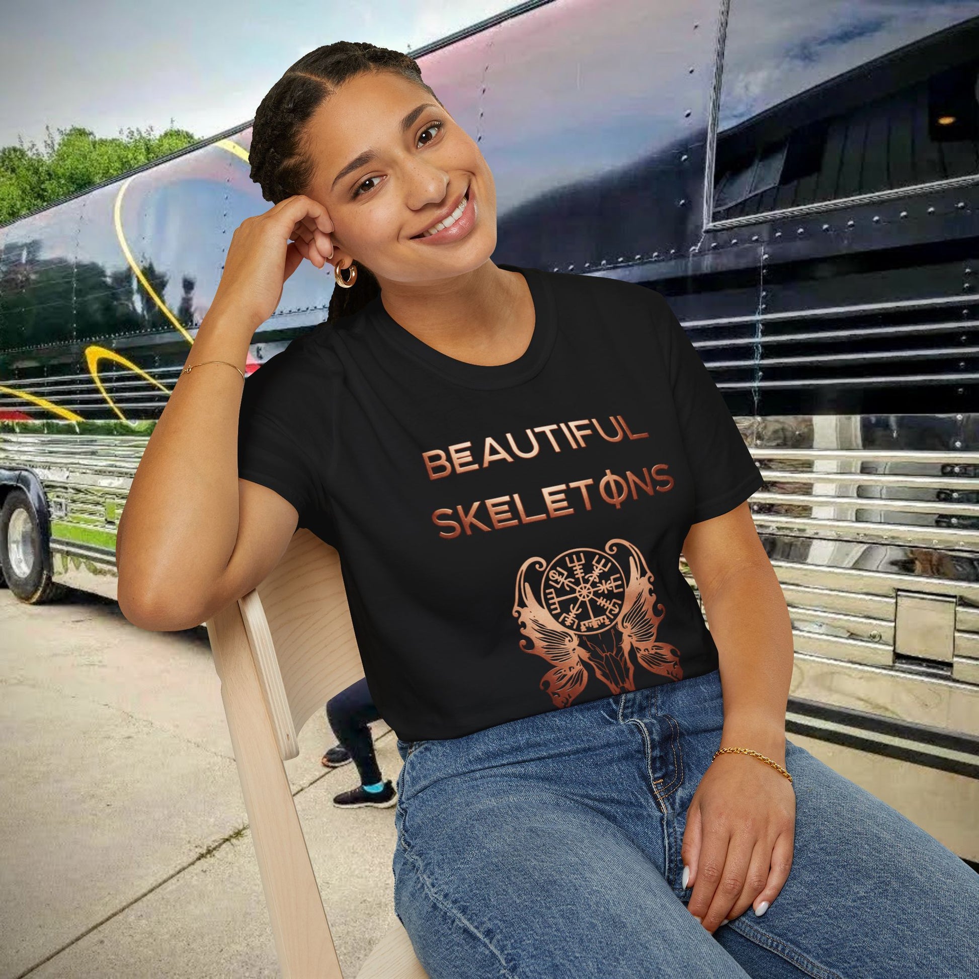 The Gildan Softstyle T-shirt is a bold black cotton tee that reads like an anthem for night-minded music lovers and road-weary fans. The neon-green graphic—an ornate skull fused with mirrored winged motifs and the words “BEAUTIFUL SKELETONS”—pops against deep black for high-contrast stage-ready style. Wear it on the tour bus, at late shows, or while swapping patch-covered jackets between sets. It feels lived-in from the first wear: lightweight, breathable, and crisp enough to layer under a denim jacket or throw on solo for a statement look.